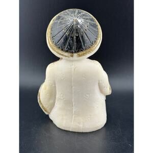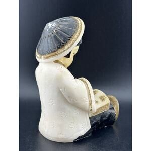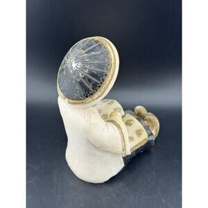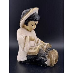 This charming figurine depicts a young girl with short black hair, dressed in a simple white outfit, engrossed in a book. Its vintage charm and detailed craftsmanship make it a delightful collectible or decorative piece for a cozy reading nook. The subtle use of color and expression captures a moment of quiet curiosity and childhood innocence. 5.5" x 4.5" x 3.75".