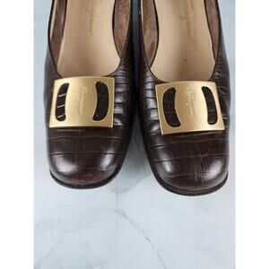 You'll love this beautiful vintage pump, perfect for casual and formal occasions. 90's style square toe with block heel, brown leather with a snakeskin or crocodile texture, gold medallion with Ferragamo logo on toe box. Very gently used, most signs of wear are on interior. See photos!