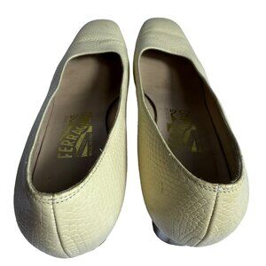 Channel refined vintage sophistication with these iconic Ferragamo pumps. Crafted in Italy from luxe, lizard-embossed leather in a creamy off-white hue, they feature a sculpted stacked heel and signature craftsmanship that defines the Ferragamo legacy. Gently worn and well preserved, with light yellowing of the leather that adds vintage charm, not distraction.