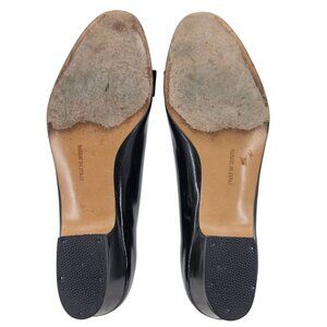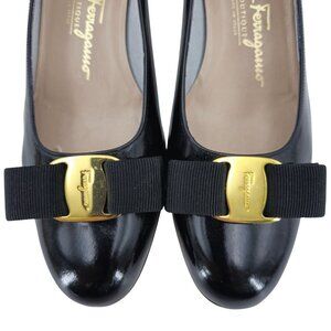 These vintage Salvatore Ferragamo Vara bow pumps exude timeless elegance and sophistication. Made in Italy, they feature glossy black patent leather, gold-tone hardware, and the iconic Vara bow design. The low heel ensures comfort without compromising on style, making them a refined choice for a polished look.