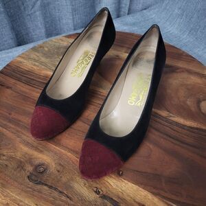Vintage Salvatore Ferragamo Mafalda Pumps Black Suede Dark Red Toe Cap Size 7.5