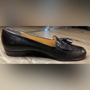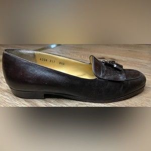 Used condition vintage men’s Ferragamo leather loafers. Dark brown color. Features two tassels on top.