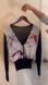 EUC Vintage Salvatore Ferragamo women's cardigan/knit top featuring a black knit back and sleeves with a silk front panel that has a vibrant, abstract floral or paisley print.