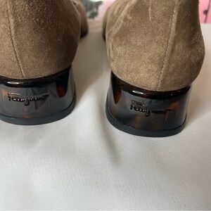 Elevate your shoe collection with these vintage Salvatore Ferragamo pumps. The classic tan suede upper is accented with a square toe and a block heel, making them both stylish and comfortable for work or casual wear. The slip-on design and leather lining material add to their convenience and durability. These pumps are perfect for any occasion and are a must-have for any fashion-forward woman. The suede upper material is of high quality and the leather lining ensures a comfortable fit. These pumps are handmade and feature a solid pattern. They are available in US shoe size 6 and have a mid-height of 2-2.9 inches. These Ferragamo pumps are a perfect addition to any wardrobe and are ideal for the winter, fall, and spring seasons.