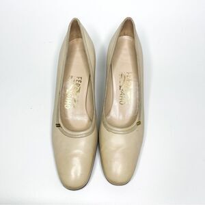 Step into timeless elegance with these vintage Salvatore Ferragamo pumps. Crafted in Italy from soft beige leather, these classic heels feature a low, comfortable heel and the signature Ferragamo gold-tone logo detail at the trim. With a sleek almond toe and luxurious leather lining, they offer both sophistication and style.