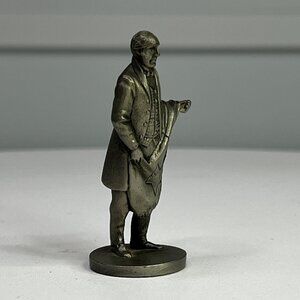 This collectible pewter figurine of Sam Houston is a fine piece crafted by National Historical Society in 1980. Its antique charm and historical significance make it a treasured addition to any collection. Sam Houston, a key figure in Texas history, is depicted holding a flag, making this an interesting piece for history enthusiasts. Size: 2 1/4" tall.