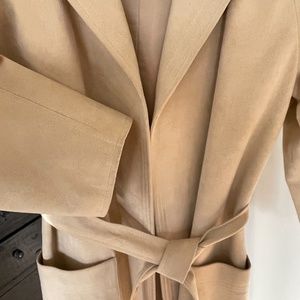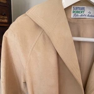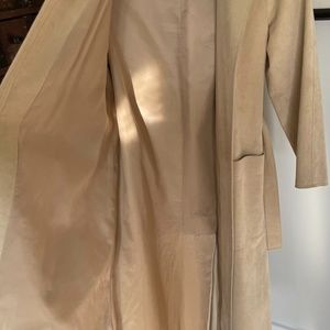 Faux vegan suede machine washable wrap women's trench coat. Originally purchased from Bonwit Teller, this will be a timeless classic in your wardrobe for years to come! This is closer in color to a warm winter white than a true tan. The coat is in near perfect condition, lining is in tact, no rips or tears.