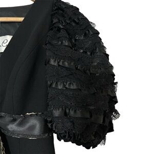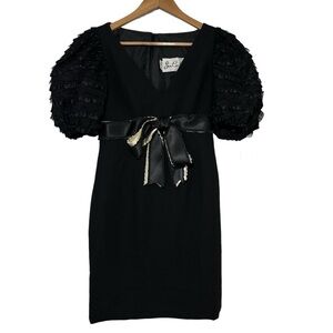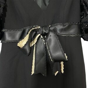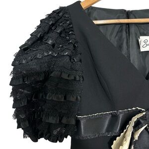 Vintage San Carlin Black Puff Ruffle Lace Sleeve Cocktail Dress Satin Bow 80s