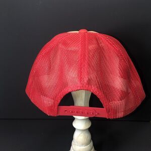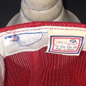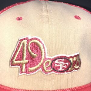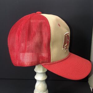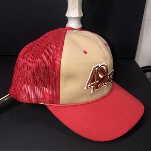 The Vintage San Francisco 49ers Hat Cap by Youngan is an officially licensed snapback trucker cap featuring the team's iconic script logo. Made for football fans, this red cap is a stylish way to show support for the San Francisco 49ers during the regular season. With a one-size fit and a classic design, this hat is perfect for male fans looking to add a touch of team pride to their wardrobe. Made in Korea, Republic of, this cap is a must-have for any die-hard 49ers supporter.**** NFL tag is missing. Shows signs of lite wear, a little yellowing on inside band in front. Please see pics for condition.