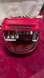 The lovely Cable Car is wood and painted red, green and white and has antique brass accents and handles. It sits nicely on a round wood base that is a deep red color with golden writing.