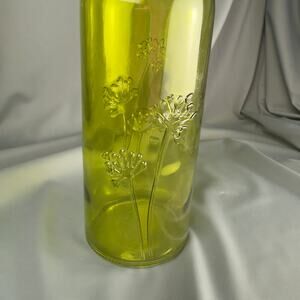 Vintage San Miguel recycled glass vase in olive green with embossed floral reliefs along the sides. Tall cylindrical bottle form with a wide flared rim and textured base. Measures 8.5" tall x 2.5" wide. Crafted in Spain using 100% recycled glass, known for natural bubbles, thickness, and charming imperfections. Perfect accent for mid-century modern, boho, or cottagecore home styling.