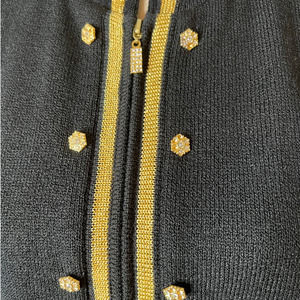 Vintage San Remo by Laura Knits cardigan sweater in black with gold trim and rhinestone button trim on each side of the full zipper.