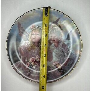 This beautiful collector plate by Sandra Kuck is a must-have for any angel enthusiast. The round plate features a stunning pink color and is made of high-quality porcelain material. The plate is 7.5 inches in diameter and has a gold rim that adds a touch of elegance to the design. The plate is perfect for displaying on a shelf or as a centerpiece on a table. Its vintage style and unknown time period of manufacture make it a unique addition to any collection. Whether you're a collector or just looking for a beautiful decorative piece, this Sandra Kuck collector's plate is sure to impress.