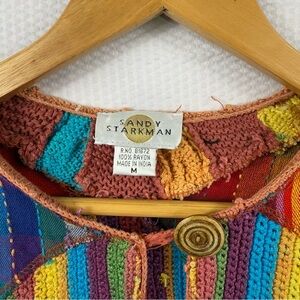 One-of-a-kind vintage Sandy Starkman jacket featuring bold patchwork design with mixed textiles including denim, hand-knit rayon, embroidery, and beaded details. Handmade in India, this artisan-style jacket is bursting with vibrant colors and eclectic 90s flair.