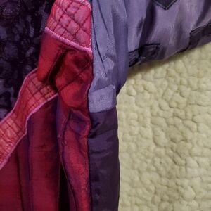 This Vintage (1980s) Sandy Starkman Jacket in XL size is a stunning burgundy, pink, and blue paisley patchwork boho piece made from silk, velvet, lace, beads, embroidery and satiny materials to make a multi-textured art-to-wear jacket. With long sleeves, a button closure, and a regular fit, this jacket is perfect for casual occasions in the winter, fall, or spring seasons. The patchwork quilted style, lace and embroidered accents, and colorful bohemian theme make it a unique and stylish addition to any woman's wardrobe.