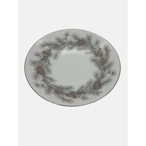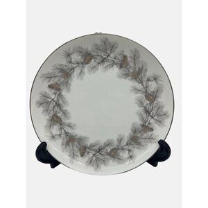 Sango Fine China salad plate and fruit / dessert bowl in the discontinued Sierra Pines pattern. The Sierra Pines pattern is white with pinecones and pine needles on the border. The salad plate measures 7.5" and the fruit bowl is 5.5". The china is #6608 and was made in Japan.