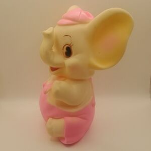 This delightful rubber Elephant features a cream body and a right pink outfit, complete with large, welcoming ears and a joyful smile. It's in excellent condition with only a few marks shown in pics. Pls review video to hear it still has its squeeker!!