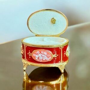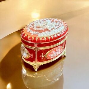 * This is a vintage Enamel Gilt Footed Cameo Music Jewelry Box with a red and gold color scheme.