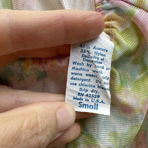 Very Good Used Condition. No Holes or Stains. There are a few spots along neckline where elastic is stretched out. Example shown in last photo. Sleeve elastic is good.