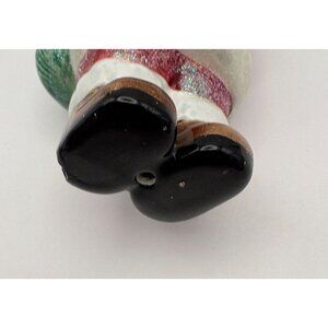 This vintage Santa Claus ornament adds timeless charm to holiday décor. Glitter accents and a green sack enhance its festive design.