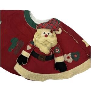 Festive vintage Christmas tree skirt featuring a plush Santa Claus with patchwork details, button accents, and sherpa trim. Measures 39" in diameter. Great vintage condition with some light wear consistent with age. Adds a classic holiday charm to any Christmas décor.