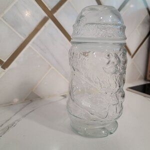 A Vintage Santa Claus clear glass jar for kitchen storage or candy, featuring a festive design. Ideal for holiday decoration and practical use.