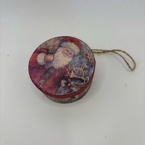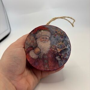 Charming round ornament featuring Santa Claus. Perfect for holiday decor. Includes a rustic string for hanging.