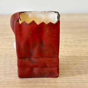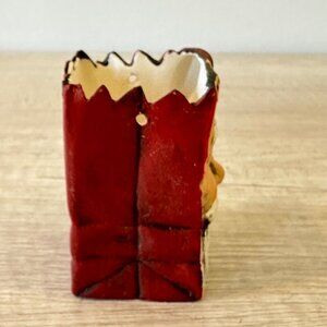 Charming hand-painted ceramic holder with a whimsical Santa face and gift box shape. Perfect for festive displays, small holiday treats, or as a nostalgic decorative accent.