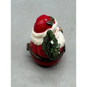 This hand-painted ceramic trinket box features a detailed Santa Claus holding a Christmas tree and pipe. Ideal for holiday decor or keepsakes.