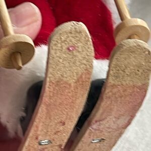 Vintage Santa Clause hanging standing Christmas ornament. Hard plastic face, hands and boots. Wood skies and poles, red wool felt suit with faux fur trim and long beard. Belt and wire glasses. He has a loop to hand and also stands well by himself. Minimal wear.