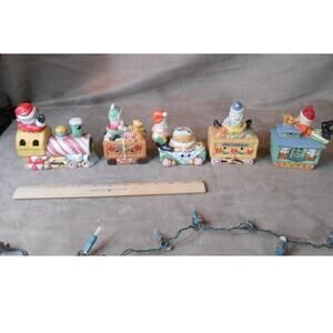 Vintage Santa Express Ceramic Train w/Lights Christmas Village 5 PC Please READ. Very cute 5 piece ceramic features Santa Clause. There is one train engine and four train cars each with a different Santa scene! Comes with a string of lights that can light up each piece. Lights do get hot when left on for a period of time--might be a great project to rewire for LED lights. Also the metal clips for the lights are worn and at least one is broken. The last car Santa has broken feet that were repaired. Please see pictures.