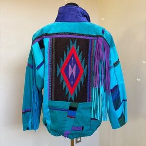 Keywords / Tags: Southwestern jacket, Western fringe coat, cowgirl jacket, Aztec print jacket, Navajo style coat, boho festival jacket, kilim tapestry jacket, Santa Fe style, 1980s vintage jacket, collector’s western coat.