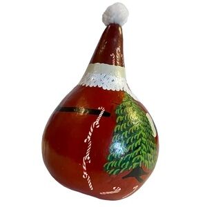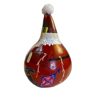 This whimsically painted Santa is sure to bring a smile to your face. The use of gourds has a rich and scientifically complex history. This adorable work of kitschy Santa Folk Art was painted and signed by “Margaret🥰!” Shake the gourd and hear the seeds rattle inside. Handmade and one of a kind.
