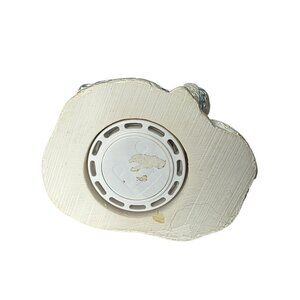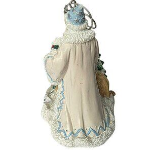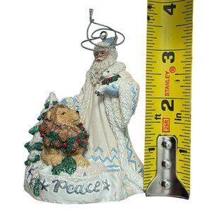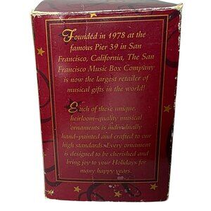 This vintage intricately designed musical ornament features a serene Santa with a lion and lamb, playing "White Christmas". San Francisco Music Box Co. Marjorie Sarnat figurine. Measures approximately 3.5 inches tall
