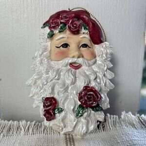 Charming vintage Santa face ornament featuring hand-painted details and red roses woven into his hat and beard. This unique piece blends classic Christmas imagery with a romantic, shabby chic twist. Made of a molded ceramic or resin material with a flat back and loop for hanging, it’s ideal for tree decorating, gift toppers, or wall accents during the holiday season.