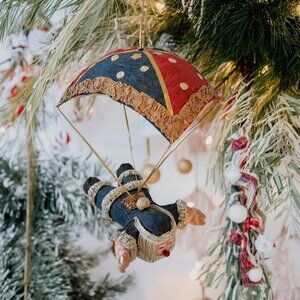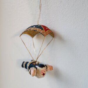 This vintage Santa is trading sleigh rides for skydives! Handcrafted from papier-mâché and finished in vivid red, navy, and gold, he’s swooping into your tree with charm and cheer. The hand-painted face and parachute details bring a nostalgic, folk-art vibe that's rare and totally adorable.