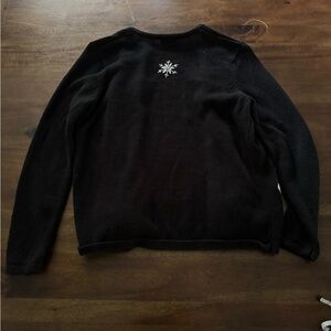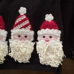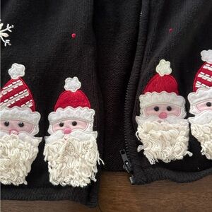 Embrace the festive spirit with this Classic Elements cardigan, featuring a striking black and red color palette. The sweater showcases a delightful holiday design with intricate snowflake patterns and charming Santa motifs. Perfect for adding a touch of seasonal cheer to your wardrobe.