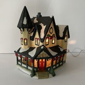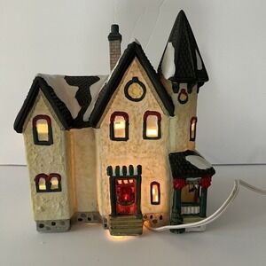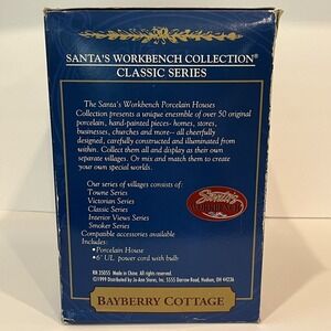 This vintage Santa's Workbench 1999 Bayberry Cottage from the Classic Series Christmas Village is a collectible porcelain house illuminated for display during the holiday season. Manufactured in 1999 by Santa's Workbench, this original piece features intricate details and is part of a classic collection. Perfect for any room in a home, this Christmas village cottage captures the charm and nostalgia of vintage holiday decor. Made in China, this vintage piece is a cherished addition to any festive holiday display.