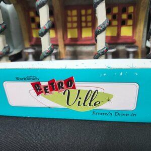 Santa's Workbench RetroVille light up Village house in Jimmy's Drive-in with the original box. Box may show some light wear, but condition of the building appears that it may not have been used previously, but I did not remove it from the box.
