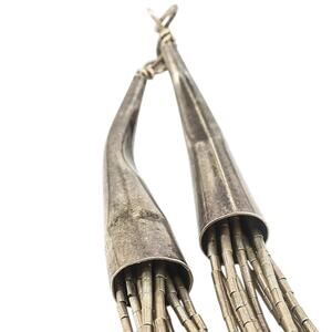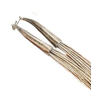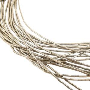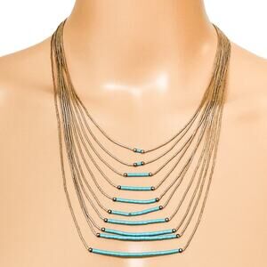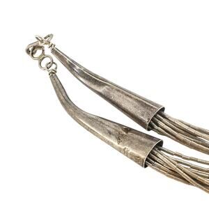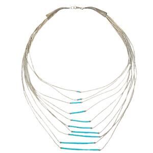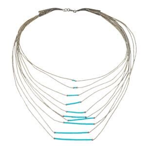 A beautifully handcrafted multi-strand heishi necklace attributed to Santo Domingo Pueblo (now Kewa Pueblo) artisans. It features ten delicate strands of turquoise tube beads accented by sterling silver beads and cones, with a hook-and-eye clasp marked “STERLING” and decorated with leaf motifs. Lightweight yet striking, this piece lays gracefully when worn and displays expert craftsmanship in traditional Native American style.