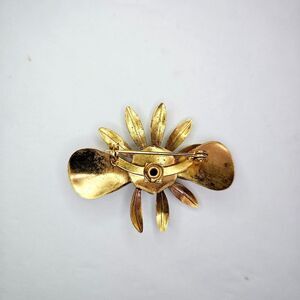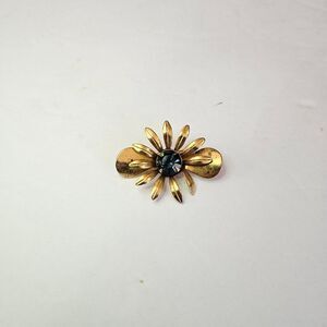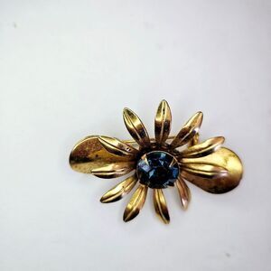 This a beautiful vintage brooch. Made with a gold tone backing in a daisy shape with a large round deep blue rhinestone set in the center. This is in good pre-owned condition with some wear to the metal setting. There is some rotation where the pieces of the setting fit together. Measures approximately 2" across.