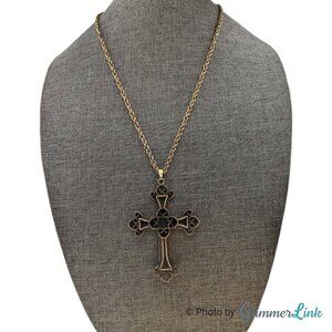 Vintage Sarah Cov Victorian Cross gold tone chain and pendant featuring a filigree statement cross hanging from a rope chain.