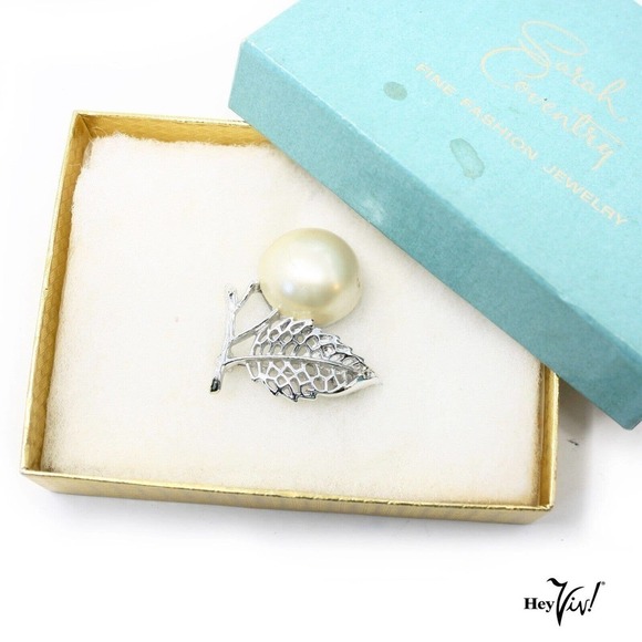 Vintage Sarah Coventry 1.5" Pin - Silver Pearl & Leaf in Original Box - Hey Viv