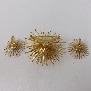 Vintage Sarah Coventry Atomic Sunburst Gold Glass Topaz Brooch & Earrings Set