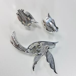 *Description: This is a beautiful Sarah Coventry brooch and earrings rhinestone set. The brooch is a bird of paradise with an open work design; an aurora borealis rhinestones pave set in silver rhodium plating. The matching earrings are each designed like a wing. They are also set with aurora borealis rhinestone on matching plating. The brooch is signed "Sarah Cov" on the back and the earrings are signed "Sarah Cov" and also have PAT PEND on the earring clips. This is a beautiful set of Sarah Coventry vintage jewelry and would make a wonderful gift or a great addition to your Sarah Coventry collection.
