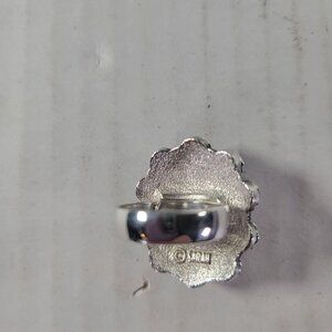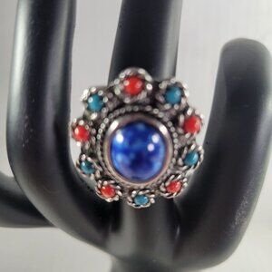 This vintage Sarah Coventry ring features a striking blue center stone with intricate red and blue accents, making it a timeless accessory for various outfits.