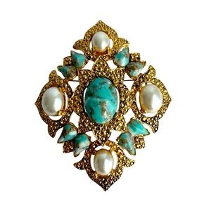 Vintage Sarah Coventry Brooch Faux Turquoise & Pearl Shield Pin Pendant Large