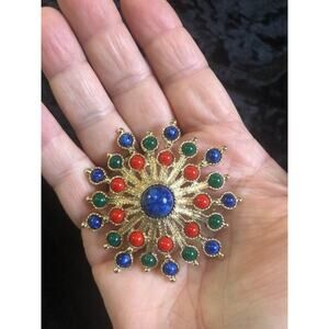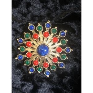 Vintage Sarah Coventry Brooch/pin Large Cabochon Multicolored Sunburst Goldtone Acrylic Red, Green and Blue Petals 2.5x2.5” Preowned