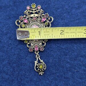 Item: Ornate costume jewelry brooch/pin with dangling drop