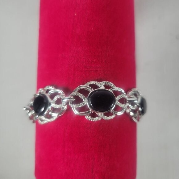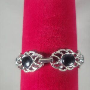 Vintage Sarah Coventry Feminine Classic Silver-Tone Black Cabochon Bracelet